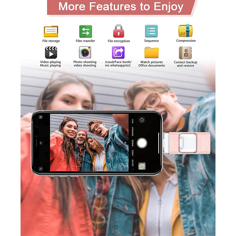 4-in-1 USB; High-speed transfer; Universal compatibility (iPhone, Android, PC); Durable and lightweight design; Intuitive app for secure backup