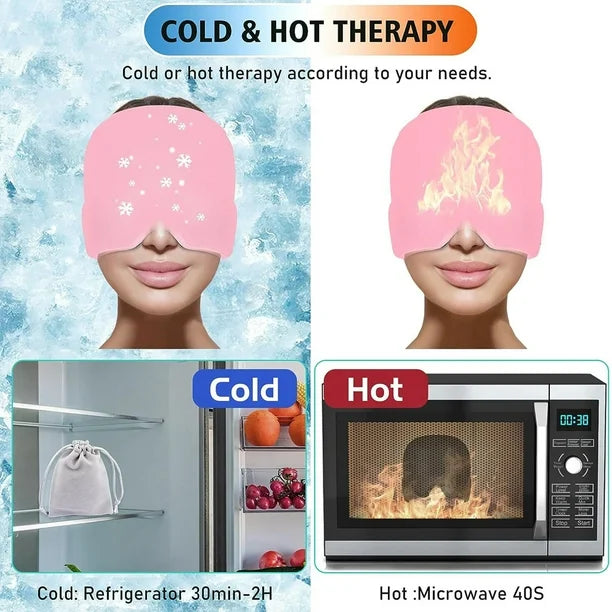 Material: Flexible, soft material with gel filling; Application: Customizable heat and cold therapy; Size: One size fits any head shape; Filling: Gel for targeted pain relief